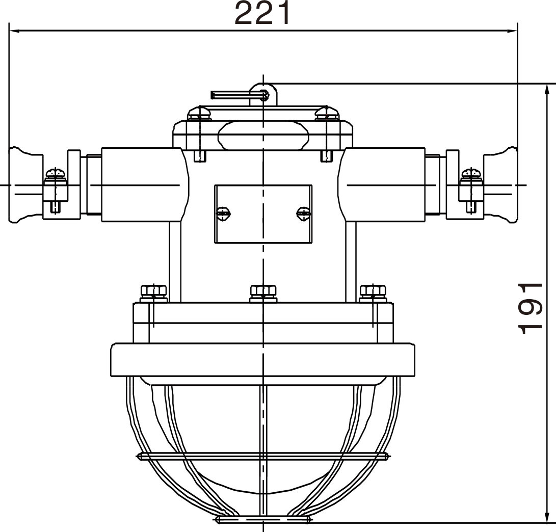 LED燈由上蓋、上殼體、下殼體、防爆透明玻璃罩、護(hù)罩等組成,上蓋與上殼體用M4螺釘連接,下殼體用M6螺釘與上殼體相連。防爆透明玻璃罩、護(hù)罩用M4螺釘固定在下殼體上。上殼體外有M4外接地螺釘、銘牌等。上殼體內(nèi)有接線板、M4內(nèi)接地螺釘、LED驅(qū)動電源板。下殼體內(nèi)有密封墊、防爆透明玻璃罩、LED光源、散熱板。散熱板通過上殼體將光源熱量散發(fā)到燈體外。上蓋、上殼體、下殼體、防爆透明玻璃罩之間均有符合規(guī)定的隔爆接合面隔爆。