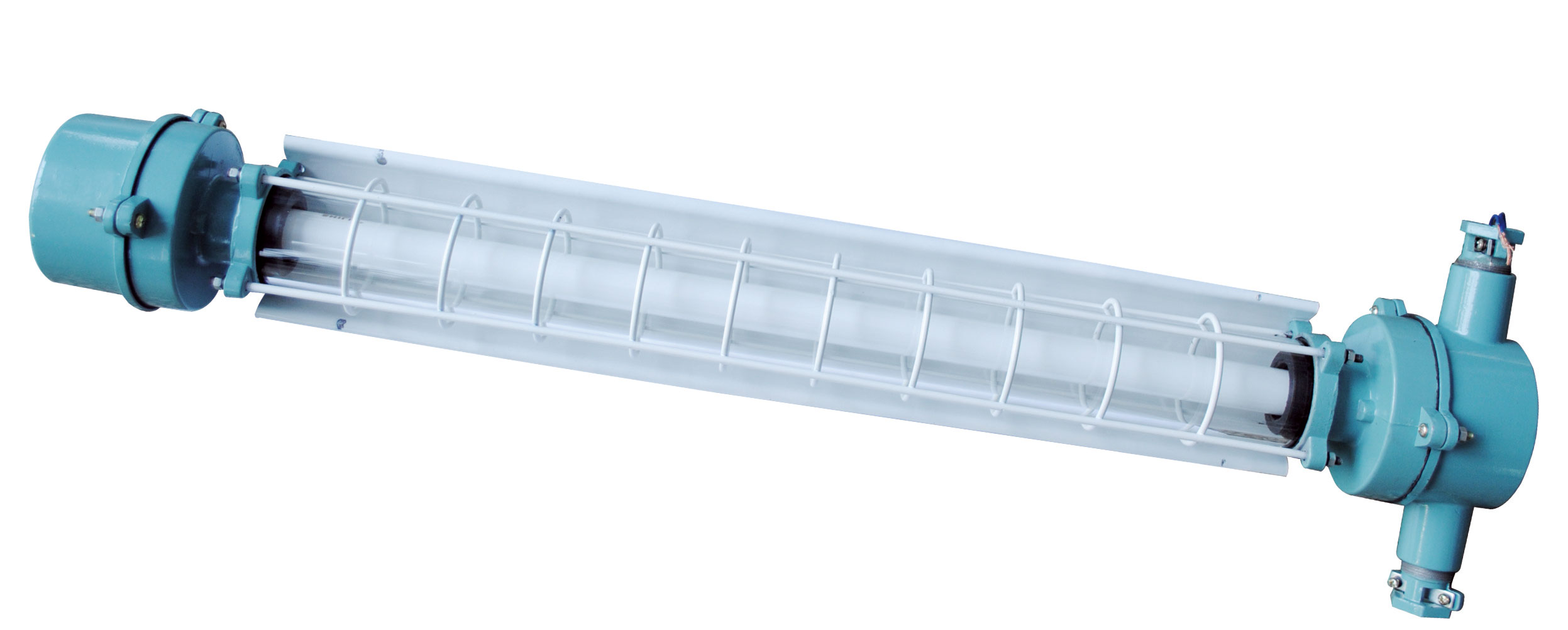熒光燈由前燈體、后燈體及光源、防爆玻璃罩、金屬防護罩等部分組成。前燈體由鋁合金外殼、蓋、啟輝器、插座等部分組成,前端蓋上設(shè)有電纜引入裝置和外接地螺釘。后燈體由鋁合金殼、蓋、鎮(zhèn)流器、插座等部分組成。光源腔與接線腔,燈具內(nèi)腔與外界均有符合規(guī)定的防爆接合面防爆。