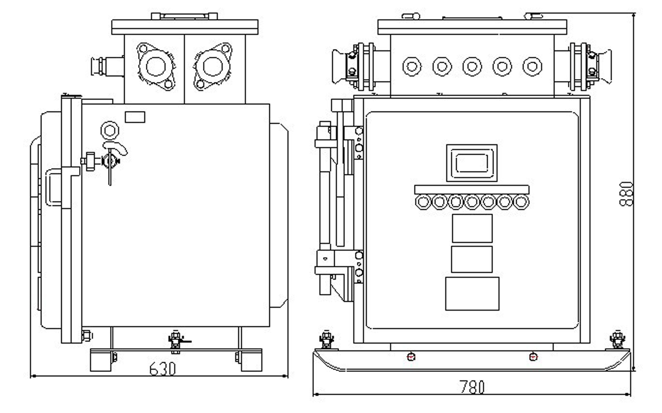 綜合裝置由隔爆外殼、主變壓器和控制部分等組成。隔爆外殼為方形,殼蓋與殼身采用滑動(dòng)止口結(jié)構(gòu),開啟方便。外殼上部的接線箱作為引進(jìn)和引出電纜用,外殼右側(cè)裝有操作組合開關(guān)的手柄,并有可靠的機(jī)械聯(lián)鎖裝置,門蓋上裝有控制按鈕和試驗(yàn)按鈕,門蓋上有一觀察窗,可以從外面觀察到裝置里面液晶漢顯顯示屏的指示狀態(tài)。殼體內(nèi)的控制部分由控制器件板和真空交流接觸器板組成。在控制器件板上裝有微電腦控制器、液晶顯示屏、電流取樣板、電流傳感器、濾波器、電源控制變壓器、試驗(yàn)電阻、保險(xiǎn)等器件。真空交流接觸器板上裝有真空交流接觸器、管式熔斷器,電流互感器,三相電抗器等器件?刂破骷迮c真空交流接觸器板通過(guò)一組航空插件及連線構(gòu)成聯(lián)系。防爆外殼箱體內(nèi)裝有主變壓器。